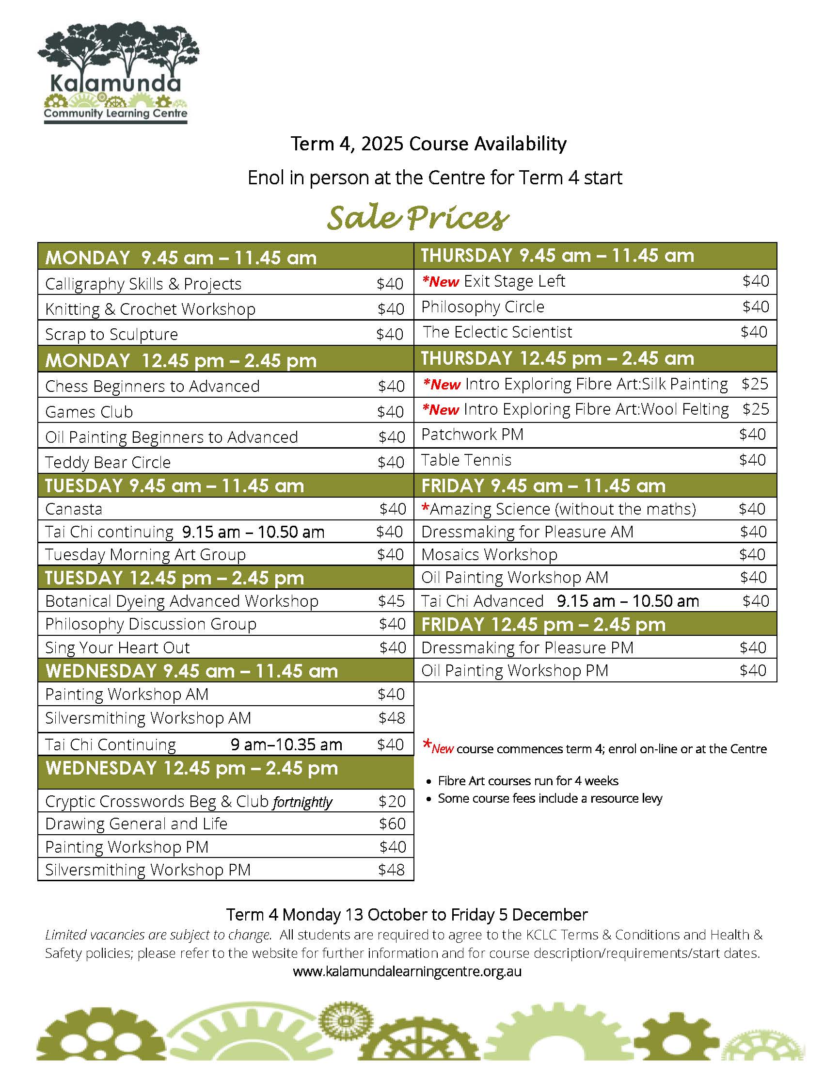We still have a few vacancies for some courses in Term 4 (see below). These can be enrolled in by visiting reception in the first week of the term. New courses commencing in Term 4 can also be enrolled in online over the break. We request that members enrol in these courses ready to start in the first week to minimise the disruption to classes.