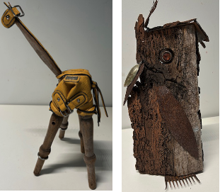 The project was to make a lean body/torso/limbs. Lots of skinny folk appeared. We generally use wood off cuts, bush boughs, old chair legs, kitchenalia, discarded frames and bits of fabric, feathers, rusted metal, washers, wire, beads, and paint.